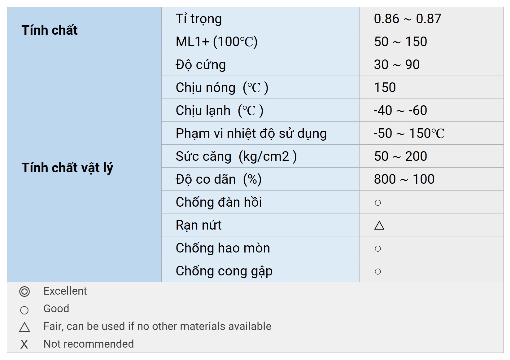 Cao su EPDM là 1 loại vật liệu đàn hồi. Có khả năng chống lão hóa, ozon, thời tiết, hóa chất, mài mòn, nước, rượu và xeton và không thể sử dụng cho mục đích thực phẩm hoặc tiếp xúc với hydro thơm.